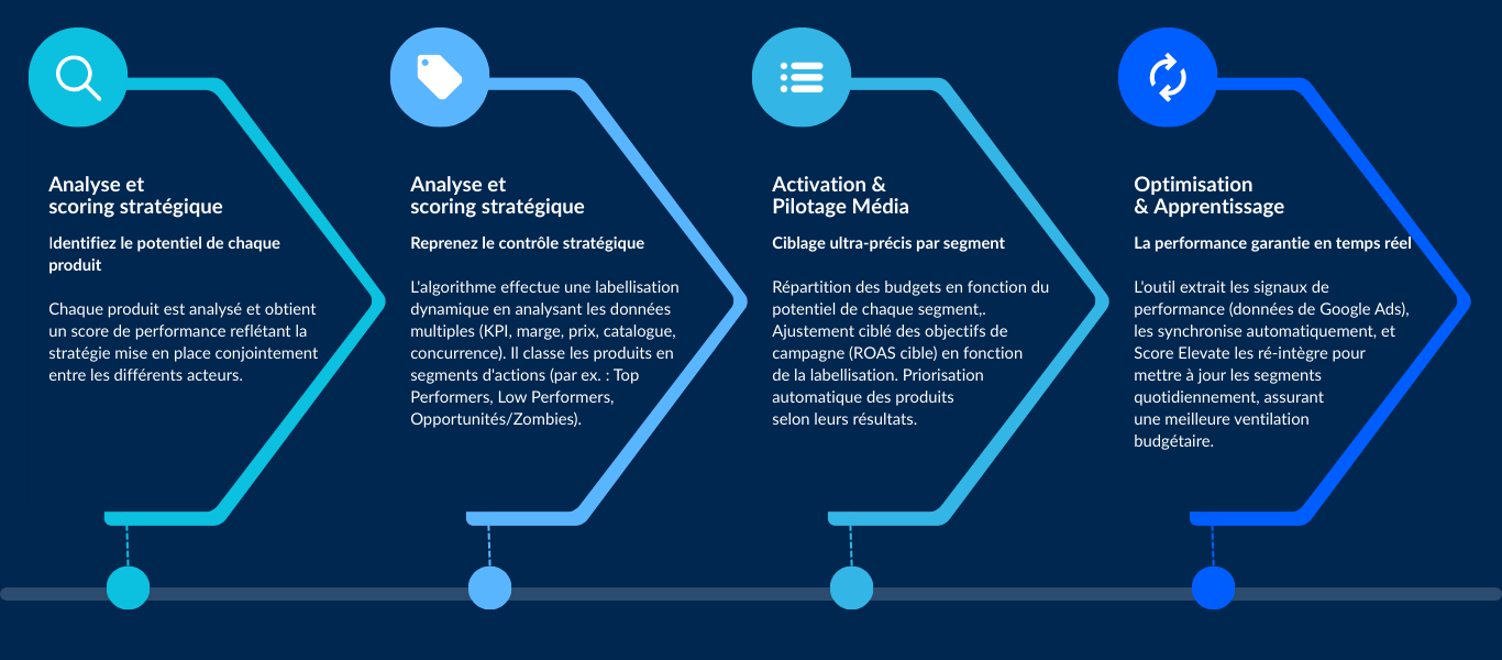Le Score Elevate est un cercle vertueux qui extrait les données de performance de Google Ads, labellise dynamiquement le flux produit via les Custom Labels et structurer automatiquement les campagnes SEA via le GMC.