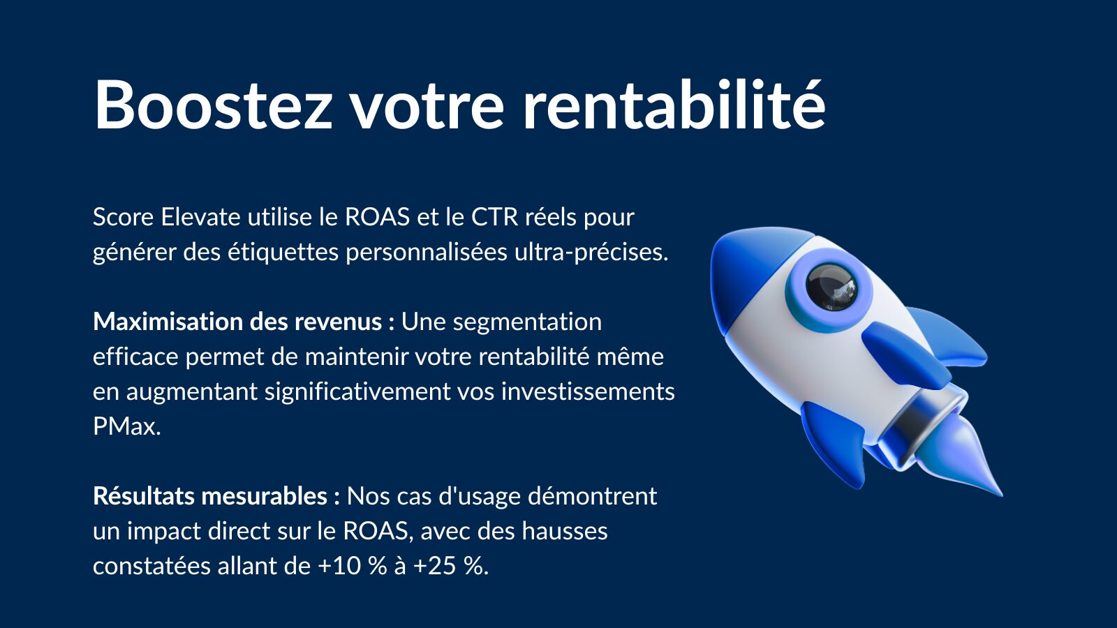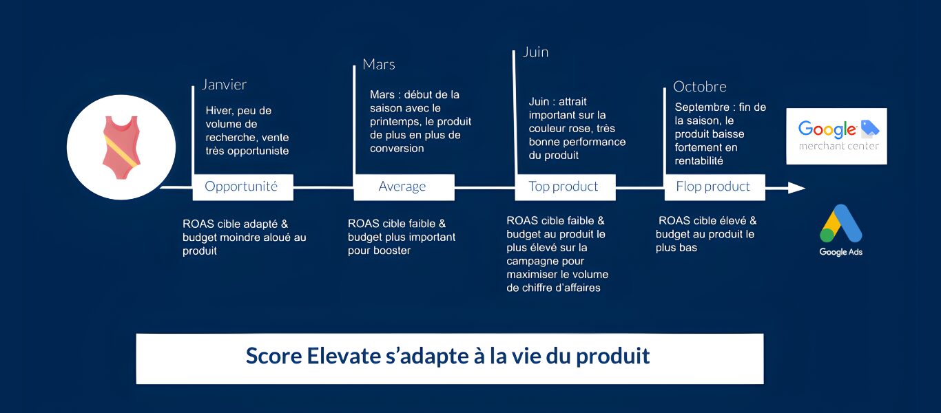 Le Score Elevate est un programme stratégique et 100 % automatisé de segmentation intelligente des catalogues e-commerce, conçu pour regrouper dynamiquement les produits selon leur rentabilité et leur potentiel afin d’optimiser les campagnes Google Shopping et Performance Max