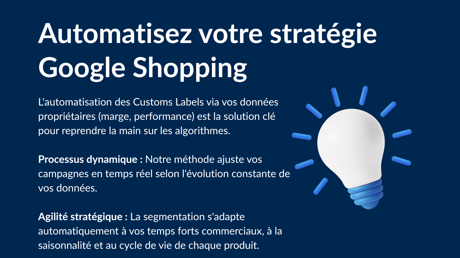 Face aux algorithmes de Google qui rendent la gestion des campagnes plus opaque, Score Elevate permet de reprendre le contrôle sur les investissements publicitaires. En utilisant la segmentation (via les Custom labels), il devient possible de personnaliser finement les stratégies d’enchères et d’ajuster les budgets, ce qui permet de différencier la pression des enchères en fonction des objectifs spécifiques de l’entreprise, comme la marge